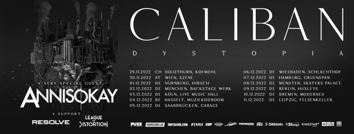 Mit ihrem neuen Album „Dystopia" meldet sich die Metacore-Instiution Caliban zindrucksvoll zurück auf den Bühnen dieser Welt. Es ist das bereits das dreizehnte Studioalbum in einer Karriere, die sich nun auch schon der Marke eines Vierteljahrhunderts nähert, sorry to be breaking the news to you. Die gute Nachricht dagegen: Caliban bleiben genauso unerbittlich und erderschütternd wie auf den härtesten ihrer früheren Alben. Freuen wir uns auf einen Abend voller Death Metal, Thrash Metal und Hardcore! Von Caliban und nicht zuletzt von ihren Special Guests Annisokay aus Halle, Resolve und League Of Distortion.