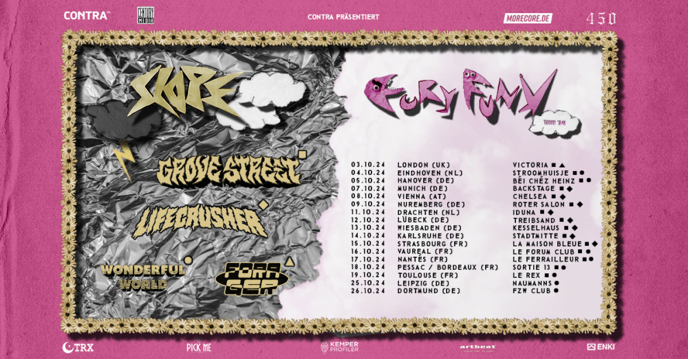 Mit ihrer Hardcore/Punk-Attitüde, verschmolzen mit Einflüssen aus Funk und HipHop, haben Slope aus Duisburg einen ziemlich einzigartigen Stil entwickelt, den das Quintett auf ihrem im Februar bei Century Media erschienenen zweiten Album „Freak Dreams“ noch einmal feiner ausbuchstabiert hat. Groovy-grungy, rotzig-räudig, alles da! Nicht zuletzt für Fans von Rage Against The Machine, Turnstile , Alice In Chains und frühen Red Hot Chili Peppers ein echter Tipp. Aber auch Freundinnen von Living Colour, Clawfinger oder Beastie Boys können hier beruhigt zugreifen. Mindestens. 90er Jahre-Revival? Vielleicht. Wenn, dann wegen Bands wie dieser hier! Mit dabei am heutigen Aband: Das Hardcore/Thrash-Quintett Grove Street aus Southampton, die ihr zuletzt im Vorprogramm von Dog Eat Dog gesehen haben könntet und die Schweizer Hardcoreband Lifecrusher.